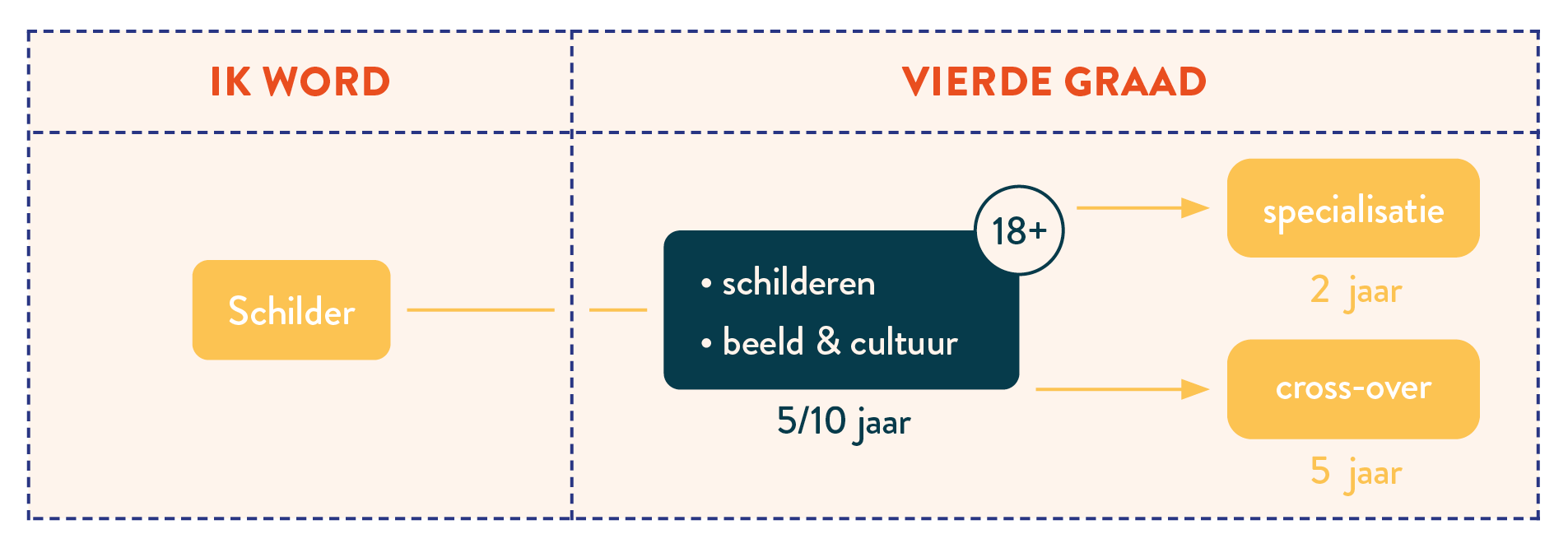 - Als je graag beinvloed bent door hedendaagse kunstenaars kan je vanaf het vierde jaar je creativiteit en verbeelding verder onderzoeken, vrij en afhankelijk waar je voorkeur naar toe gaat.