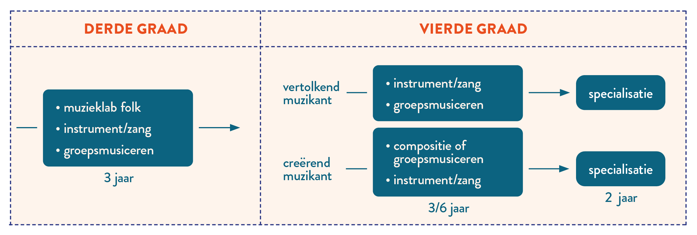 Vertrekkende vanuit jouw interesses, vragen/noden krijg je een rijke omkadering en ondersteuning wat betreft muziek en in het bijzonder volksmuziek.