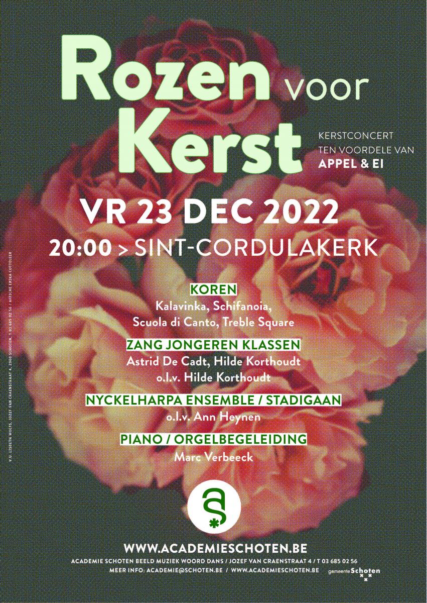 Met haar prachtige rode en groene kleuren staat de roos symbool voor liefde, naastenliefde, licht en leven! Deze boodschap van liefde en licht wordt u gebracht door maar liefst vier koren onder leiding van Hilde Korthoudt, het volkszang- en nyckelharpa ensemble onder leiding van Ann Heynen en de klassieke zangklassen van Hilde Korthoudt en Astrid De Cadt. Marc Verbeeck behartigt de piano- en orgelbegeleiding van al deze liefdevolle en muzikale eindejaarswensen. Vrijdag 23 december 2022 - 20u00 - Sint-Cordulakerk – gratis toegang |