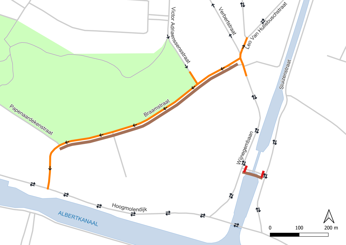 Schoten in- en uitrijden kan via de Wijnegembaan. Fietsers volgen een omleiding via het jaagpad.