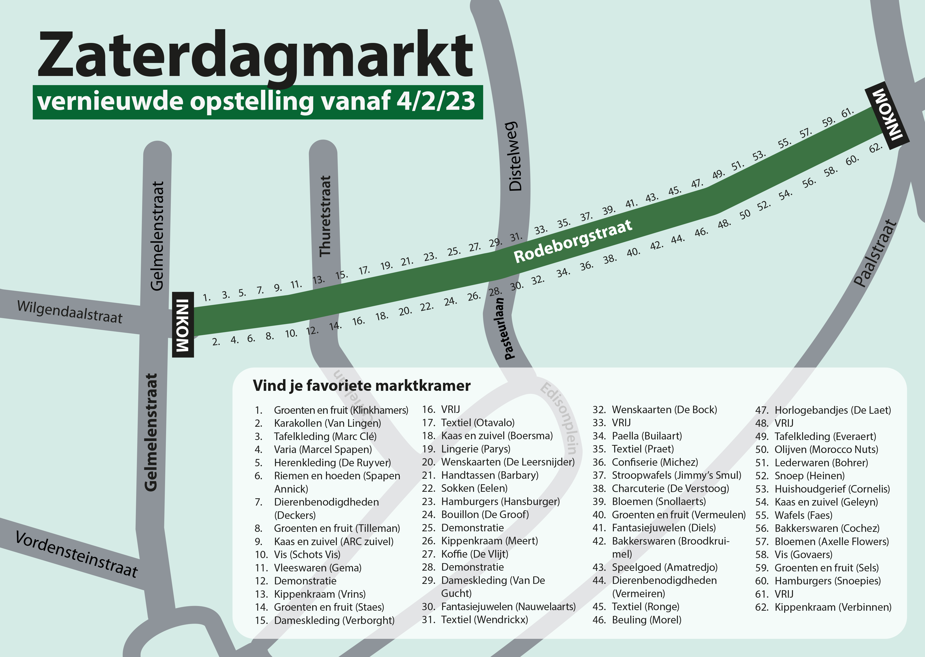 Vanaf 4 februari 2023 zal de wekelijkse zaterdagmarkt gedeeltelijk verschuiven. Er verdwijnen geen kramen, maar de marktkramers stellen hun kramen dan enkel op in de Rodeborgstraat (tussen Gelmelenstraat en Kruispadstraat). Er staan geen kramen meer in de Gelmelenstraat.