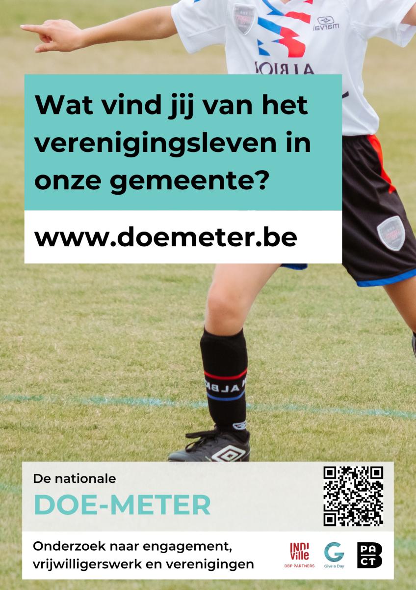 De nationale doe-meter is een initiatief van Give a Day, Indiville en Bpact, om het maatschappelijk debat over vrijwilligerswerk en verenigingen te ondersteunen. Deelnemen kan volledig anoniem. Je vindt alle informatie terug op www.doemeter.be.