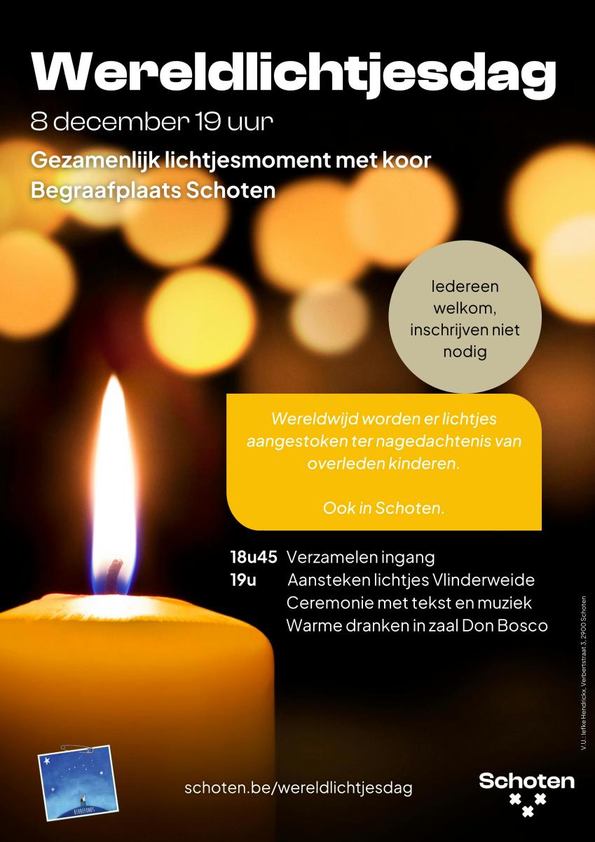 Ook in Schoten doen we mee. Ouders, familie en vrienden van een overleden kind zijn welkom op zondag 8 december 2024 om 18u45 aan de ingang van de begraafplaats (Hendrik Conciencestraat 2A). Om 19u steken we onze kaarsjes aan. Nadien worden er warme dranken aangeboden in zaal Don Bosco (Hendrik Conciencestraat 2B). Wie ouders en nabestaanden een warm hart toedraagt, is uiteraard ook van harte welkom.