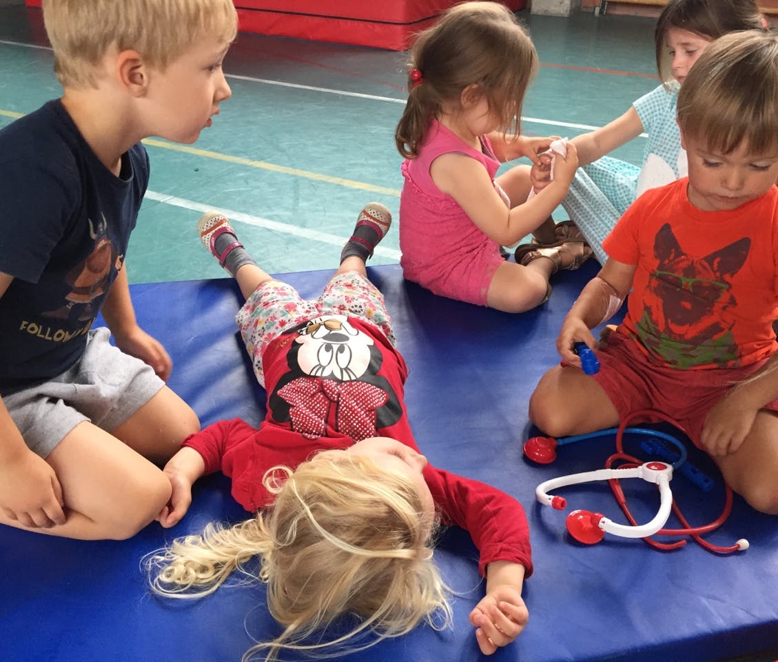 - De dokter: hoekenwerk met rollenspel waarbij we kennismaken met zwachtels, spuitjes etc.
